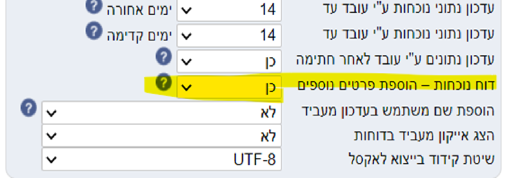 אם בוחרים “כן” אזי בדוח נוכחות יופיעו גם הנתונים של כתובת העובד, שם האב ותאריך התחלת עבודה: