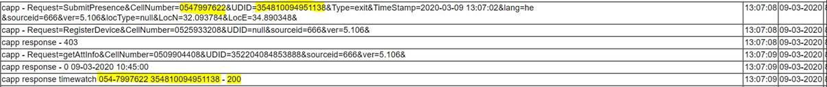 מעכשיו כאשר עושים דיווח נוכחות באפליקציה (כניסה / יציאה) אזי בשורה של התגובה שמקבלים בקלט מגורמים חיצוניים (גם חיובי = 200 וגם שלילי) מופיע גם מספר הטלפון שממנו בוצע הדיווח וגם מס’ ה-udid.  זה יקל על ההבנה של התגובה שהתקבלה – מאיזה טלפון התקבלה.